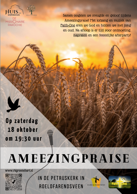 Opnieuw een AmeezingPraise-viering in de Petruskerk en wel op zaterdag 18 oktober om 19.30 uur. Dan maakt de zevenkoppige praiseband ‘Faith+one’ bezielende en temperamentvolle muziek voor God en alle aanwezigen. Het thema is ‘Oogst’. In dat kader zorgen plaatselijke agrariërs ervoor dat de kerk uitbundig versierd wordt met bloemen, planten en akkerbouwproducten. Dit mede in verband met de Oogstdankviering een dag later.