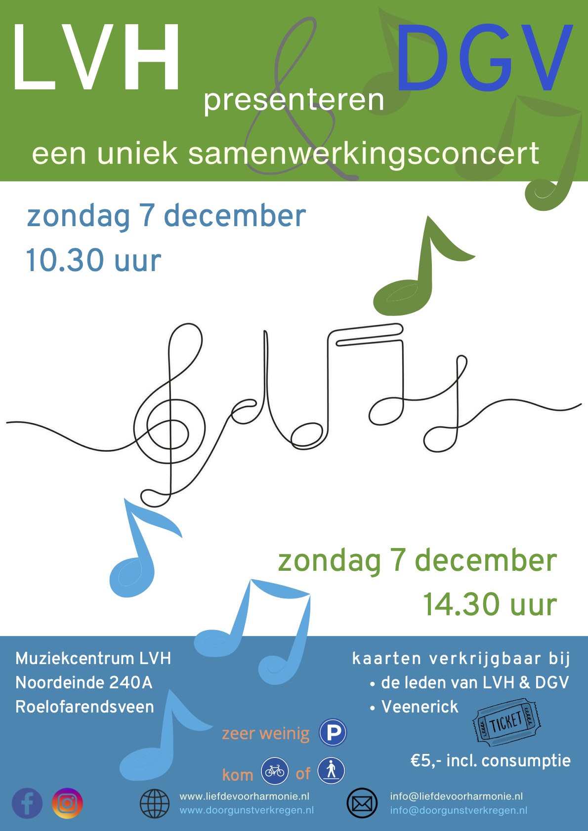 Op zondag 7 december a.s. geven Door Gunst Verkregen en Liefde voor Harmonie twee gezamenlijke concerten in het muziekcentrum van Liefde voor Harmonie op het Noordeinde in Roelofarendsveen!