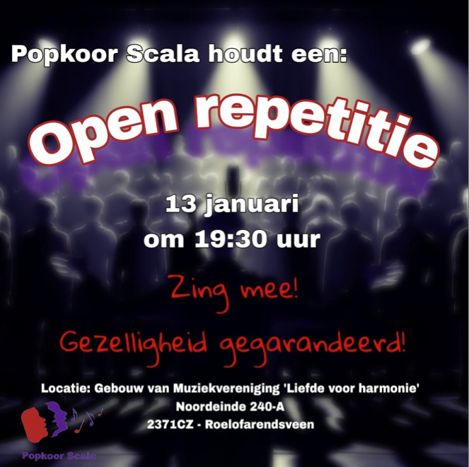 Na alle gezellige kerstzang wilt u misschien wel zelf komen proberen of popkoor Scala iets voor u is? Deze open repetitie is daar de perfecte gelegenheid voor!