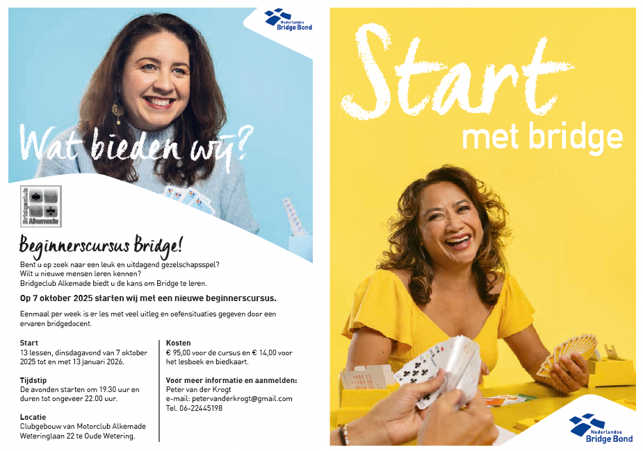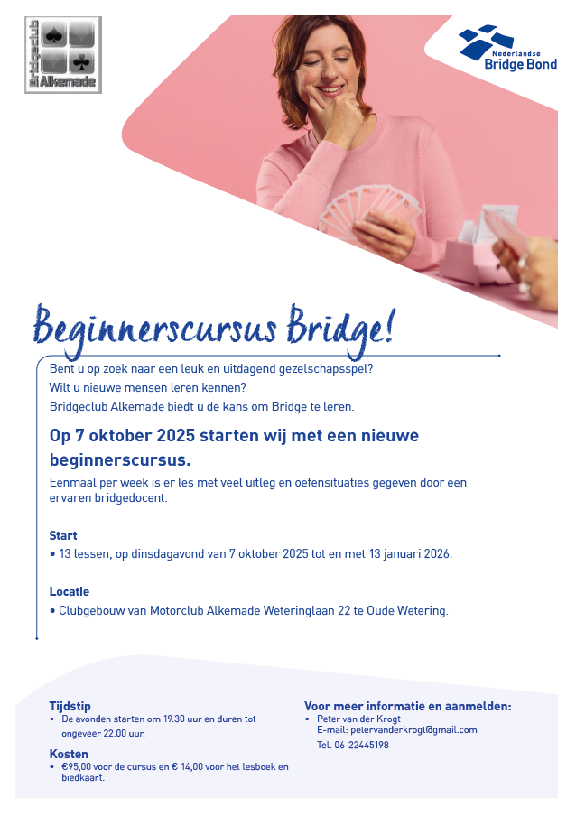 Bent u op zoek naar een leuk en uitdagend gezelschapsspel? Wilt u nieuwe mensen leren kennen? Bridgeclub Alkemade biedt u de kans om Bridge te leren.