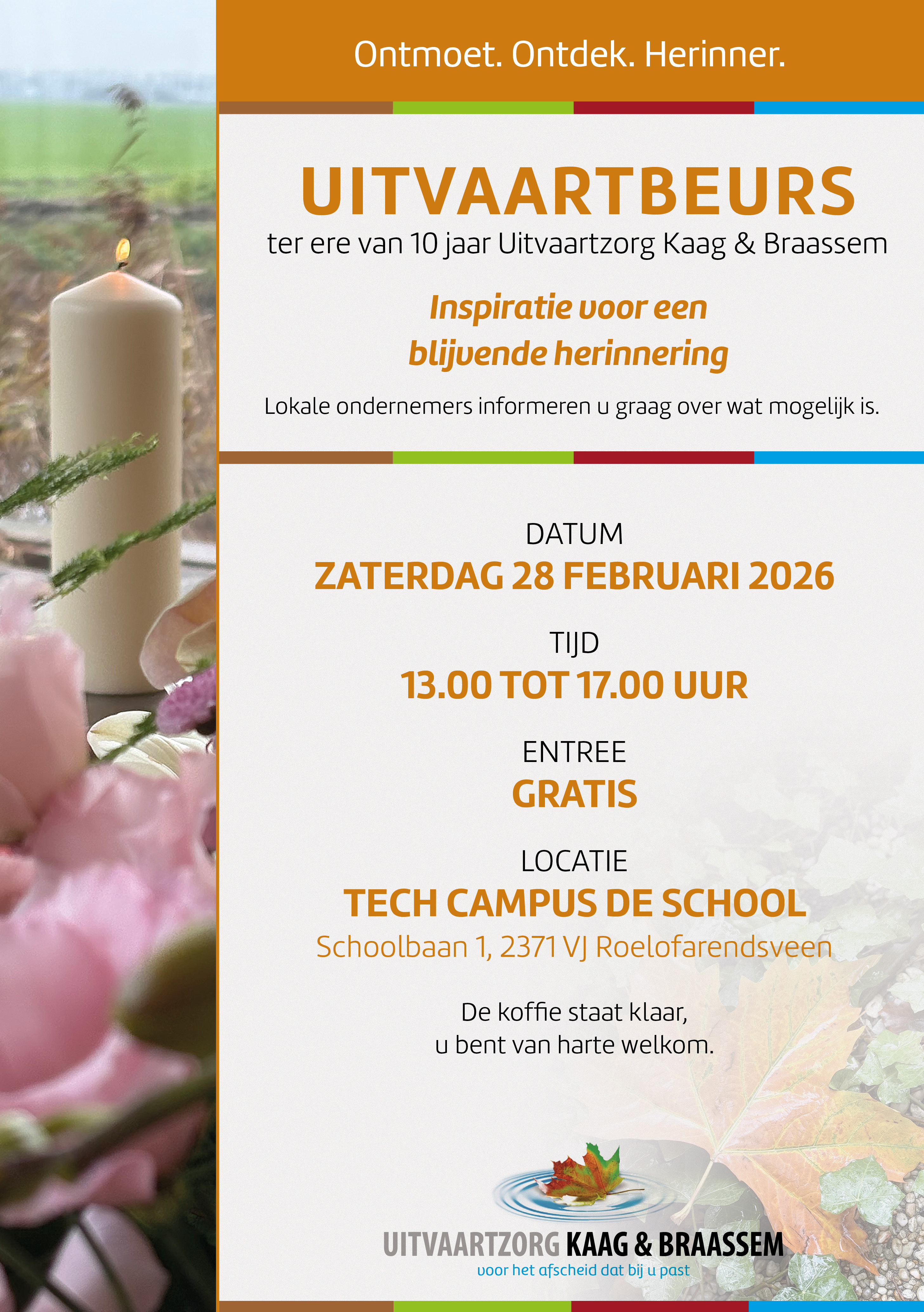 Ter gelegenheid van haar 10-jarig bestaan organiseert Uitvaartzorg Kaag & Braassem op zaterdagmiddag 28 februari 2026 een uitvaartbeurs in Tech Campus De School. Het thema voor deze beurs is ‘Inspiratie voor een blijvende herinnering’ . Met dank aan het vertrouwen dat wij de afgelopen tien jaar hebben ontvangen willen wij met deze uitvaartbeurs iets terugdoen voor de gemeenschap en (nieuwe) bewoners op een toegankelijke manier kennis laten maken met alle mogelijkheden rondom een voorgesprek, het afscheid en de herinnering van een dierbare. De uitvaartbeurs brengt diverse dienstverleners samen die hierbij betrokken. Het evenement is gratis toegankelijk voor bezoekers.