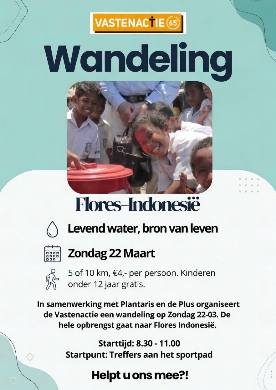 In samenwerking met Plantaris en de Plus organiseert de Vastenactie een wandeling op zondag 22-03. De gehele opbrengst gaat naar Flores Indonesië.