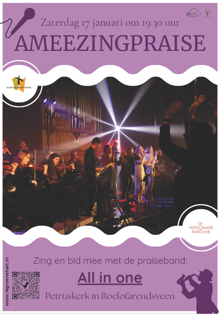 Een nieuwe AmeezingPraise viering met de professionele band ‘All-in One’ uit de Alblasserwaard op 17 januari 2026 in de Petruskerk in Roelofarendsveen. Het wordt een betekenisvolle avond aan de hand van zowel bekende als nieuwe liederen en korte overdenkingen. Ingegaan wordt op het belang van aanbidding in het dagelijkse leven. De tientallen bandleden vinden het fijn als mensen genieten van meezingen, bewegen en luisteren tijdens hun anderhalf uur durend optreden. Nog belangrijker vinden ze het dat hun boodschap over het geloof in God overkomt. De altijd spectaculaire Praisevieringen zijn gericht op jongeren en jong-volwassenen, maar spreken zeker ook andere leeftijdsgroepen aan. Na de viering is er gelegenheid om met elkaar bij te praten tijdens een gezellige after-party in de familieruimte grenzend aan de kerk. Het optreden van de band ‘All-in One’ op 17 januari 2026 begint om 19.30 uur en duurt anderhalf uur.