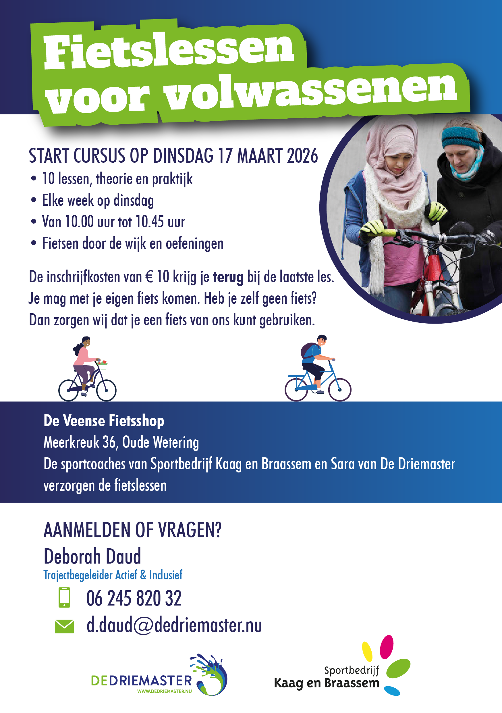 Locatie: De Veense Fietsshop, Meerkreuk 36, Oude Wetering Wanneer: Start fietslessen op dinsdag 17 maart 2026. De sportcoaches van Sportbedrijf Kaag en Braassem en Sara van De Driemaster verzorgen de fietslessen. Aanmelden of vragen? Neem contact op met Deborah Daud: 06-245 820 32 of d.daud@dedriemaster.nu