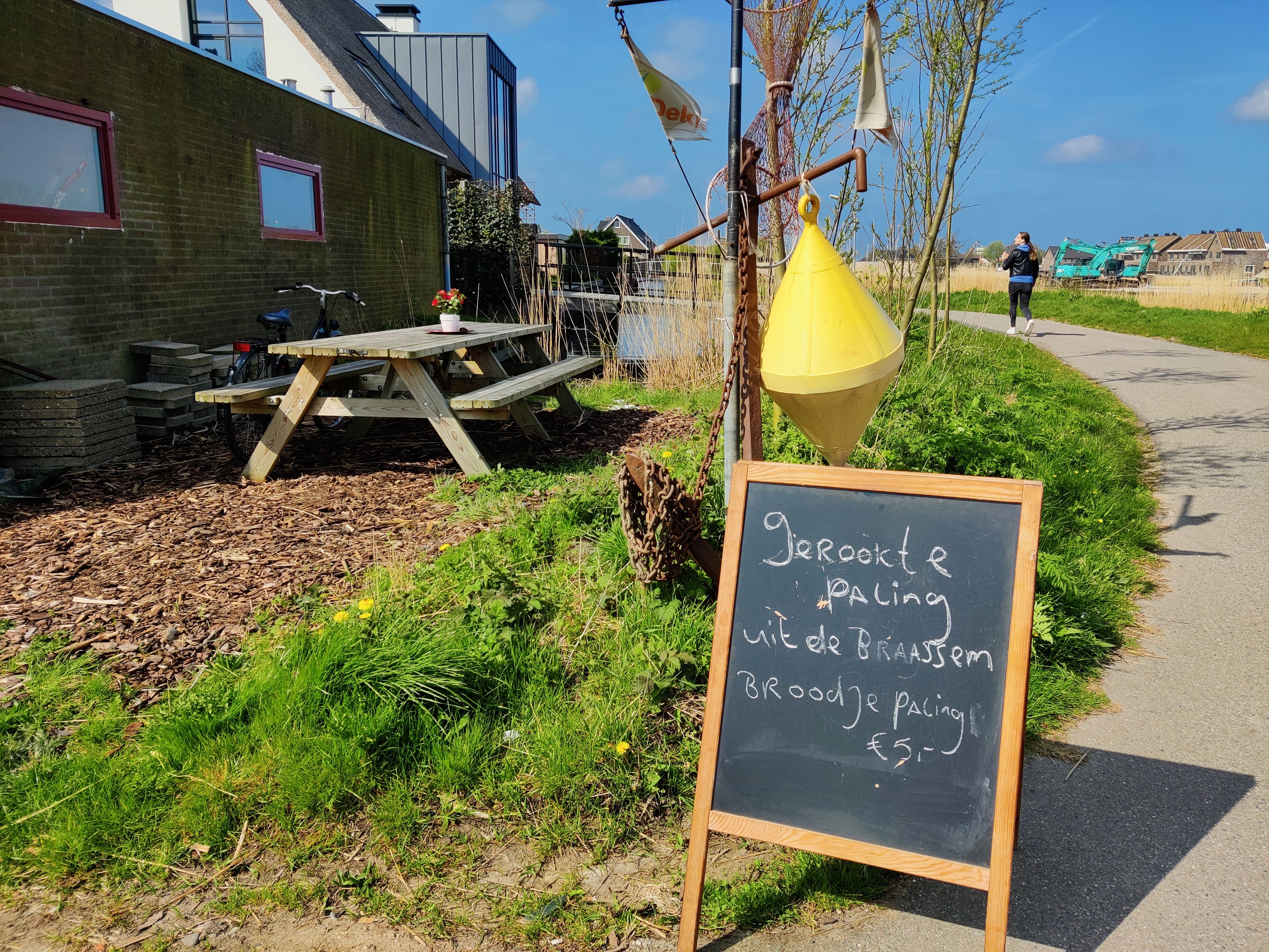 ‘We startten op de Galgekade in Roelofarendsveen, vlak bij palingrokerij Van Veen. Een kleine winkel met een ambachtelijke rokerij voor paling uit het Braassemermeer. Een uitnodigende picknicktafel maakte een relaxte lunch wel heel aantrekkelijk, dus een broodje paling voor twee! Het toetje haalden we bij restaurant Wagenaar aan het Zuideinde, waar ze van verse melk van boerderij Rotteveel in Rijpwetering hun eigen ijs maken.’