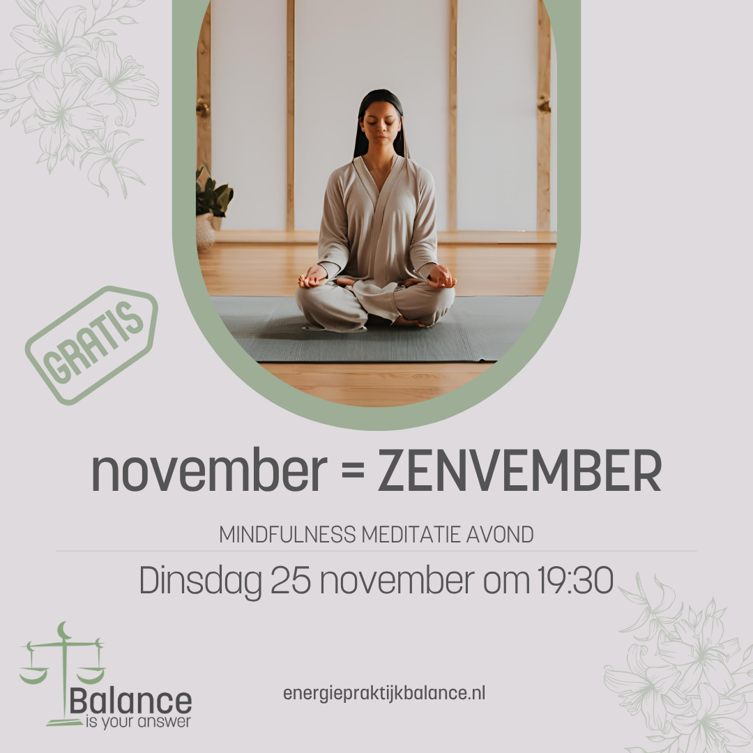 Ik wil je uitnodigen om samen van november ZENVEMBER te maken, een maand waarin we iedere dag even bij onszelf stil mogen staan. Kom en beleef in deze maand van rust en balans een avond vol mindfulness, meditatie en reflectie. Of je nu veel of weinig ervaring hebt met meditatie, iedereen is welkom.