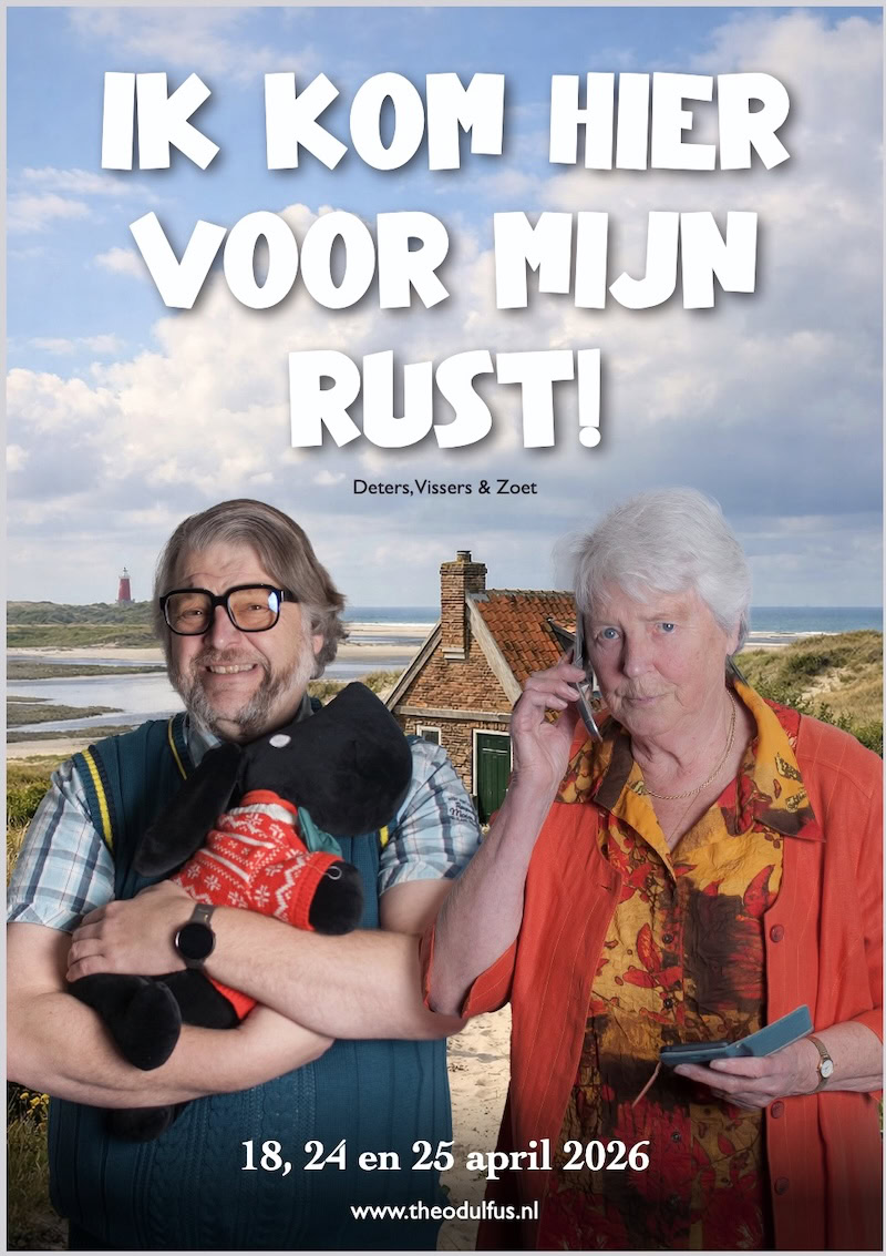 Toneelvereniging Theodulfus brengt op 18, 24 en 25 april de komische voorstelling "Ik kom hier voor mijn rust!" in Tech Campus De School in Roelofarendsveen. Een zelfgeschreven blijspel door Patrick Deters, Hanneke Vissers en Corry Zoet, speciaal gemaakt voor twee acteurs en vol herkenbare humor.